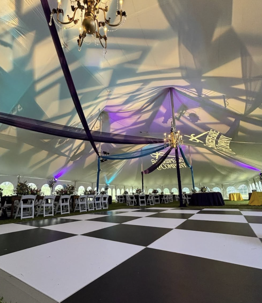 For several years, we have worked with Shakespear and Company on their tented Annual Gala. Pictured below is an excellent example of how our black and white dance floor set the stage for an evening of fun. This shows our flooring directly on grass.